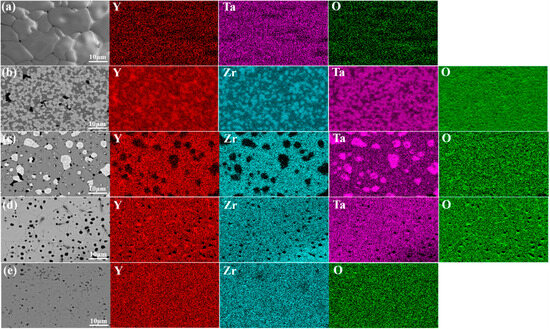 Backscattered electron (BSE) images and the corresponding EDS mappings of YT1−x–YZx (x = 0, 0.25, 0.5, 0.75, 1) composite ceramics: (a) YT; (b) YT0.25–YZ0.75; (c) YT0.5–YZ0.5; (d) YT0.75–YZ0.25; (e) YZ.