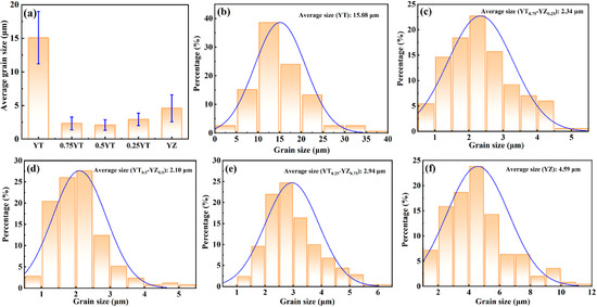 Grain size distributions of YT1−x–YZx (x = 0, 0.25, 0.5, 0.75, 1) composite ceramics: (a) average grain size of the composite ceramics; (b) YT; (c) YT0.75–YZ0.25; (d) YT0.5–YZ0.5; (e) YT0.25–YZ0.75; (f) YZ.