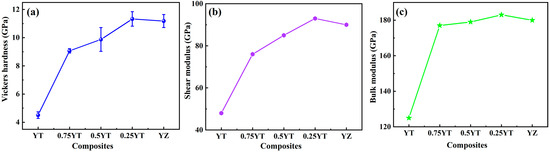 Elastic modulus of YT1−x–YZx (x = 0, 0.25, 0.5, 0.75, 1) composite ceramics: (a) Young’s modulus (E); (b) shear modulus (G); (c) bulk modulus (B).