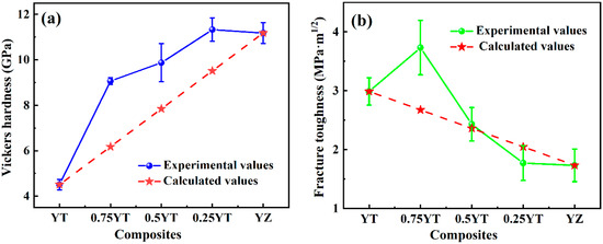 The enhanced elastic moludus implies that the composite ceramcis are expected to possess excellent mechanical strength. Figure 7 shows the experimental Vickers hardness and fracture toughness of YT1−x–YZx (x = 0, 0.25, 0.5, 0.75, 1) composite ceramics and the corresponding calculated values obtained by the mixing law. As exhibited in Figure 2 and Figure 3, the YT and YZ phases are uniformly distributed in the composite ceramics and no orientation and texture were detected; thus, we assume that the composite ceramics are isotropic materials when calculating the expected values of the Vickers hardness and fracture toughness of the composite ceramics, which are expressed as: