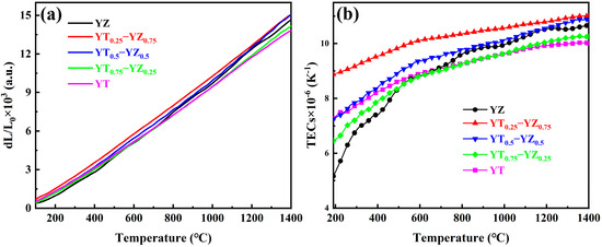 Thermal expansion properties curves of YT1−x–YZx (x = 0, 0.25, 0.5, 0.75, 1) composite ceramics at different temperatures: (a) thermal expansion curves; (b) thermal expansion coefficient curves.