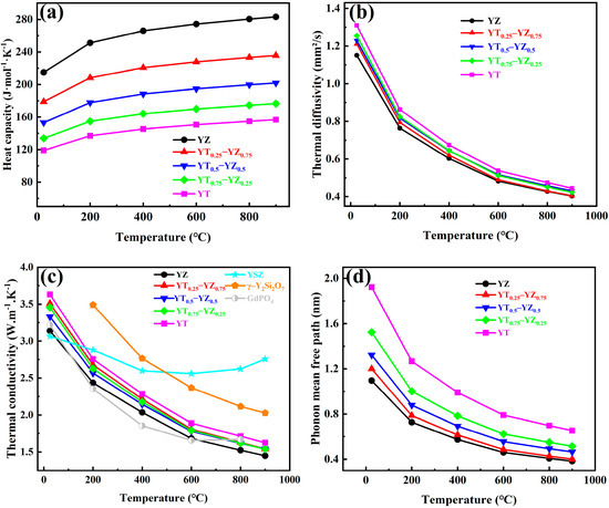 Thermal properties of YT1−x–YZx (x = 0, 0.25, 0.5, 0.75, 1) composite ceramics at different temperatures: (a) heat capacity; (b) thermal diffusivity; (c) thermal conductivity; (d) phonon mean free path.