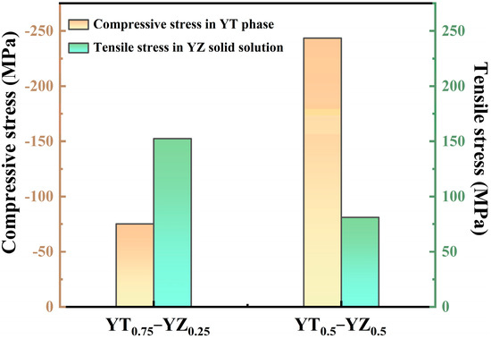 The residual stress in the YT and YZ solid solutions of dual-phase ceramics at room temperature, where the positive values represent tensile stress and the negative values represent compressive stress.