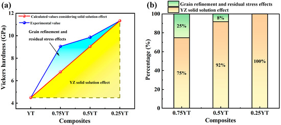 The contributions of different mechanisms to the hardness of the YT1−x–YZx (x = 0.25, 0.5, 0.75) composite ceramics: (a) absolute values of the contributions; (b) percentage of the contributions.