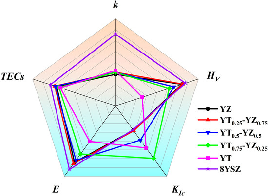 Radar chart comparing the mechanical and thermal properties of YTx–YZ1−x (x = 0, 0.25, 0.5, 0.75, 1) composite ceramics and the state-of-the-art TBC material 8YSZ.