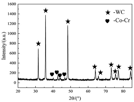 As shown in Figure 2a, the majority of the hard alloy powders exhibited a solid spherical morphology, while only a small fraction displayed a hollow spherical structure. This characteristic contributes to the good flowability of the powder, making it suitable for both plasma spraying and laser cladding. A closer examination of the cross-section of an individual powder particle is presented in Figure 2b. Each particle is composed of numerous agglomerated fine white particles, with a significant number of small pores present within the structure. This indicates that the strength of the powder particles is moderate, allowing for uniform heating during the plasma spraying or laser cladding processes. Such a feature is beneficial for achieving better deposition and forming a cohesive coating. Furthermore, the particle size and distribution of the hard alloy powder were measured using an LA-950 laser particle size analyzer, with the laser particle size distribution curve illustrated in Figure 3. The analysis revealed that the average particle diameter is approximately 32 μm, with the majority of the powder particles falling within the size range of 15–50 μm. This size range facilitates complete melting during the experimental processes, ensuring effective coating formation. Figure 4 is the XRD pattern of WC-10Co-4Cr powder. It can be concluded that the raw material powder is mainly in the WC phase.