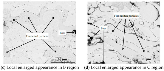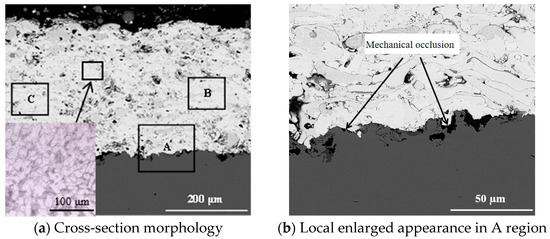 The microstructure of the atmospheric plasma sprayed (APS) coating was analyzed using a field emission scanning electron microscope (FE-SEM). The cross-sectional morphology of the coating is illustrated in Figure 5a, which reveals that the WC-10Co-4Cr coating has a thickness of approximately 500 μm on the surface of the 304 stainless steel substrate. The interface between the coating and the substrate exhibits clear mechanical interlocking, with no visible porosity or cracks observed at the bonding interface, as shown in Figure 5b. Black particles are noticeable within the 304 stainless steel substrate, particularly in the region near the bonding interface; these particles are attributed to the embedding of Al2O3 abrasive particles into the surface of the stainless steel during the sandblasting process. Figure 5c presents a localized magnified view of the coating’s interior, where several partially melted metallic powder particles can be observed. This phenomenon occurs because, during the APS process, the surface of larger particles experiences melting, while the central regions remain incompletely heated and melted, resulting in the retention of unmolten metallic powder particles within the coating. Furthermore, a classic lamellar structure is evident in the coating, as illustrated in Figure 5d. This structure is primarily composed of flattened molten particles, which form due to the melting and impact of the powder particles against the substrate during the spraying process. Subsequently, as the coating cools and solidifies, it undergoes deformation and stacking, leading to the final formation of the layered structure [20].