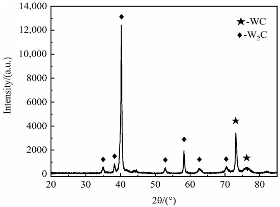 As illustrated in Figure 6, the XRD pattern of the APS coating predominantly exhibits diffraction peaks corresponding to the W2C phase, with supplementary peaks attributed to the WC phase. Compared with Figure 4, the high thermal energy generated during the APS process facilitates the rapid decarburization of WC, leading to the formation of W2C. Ding et al. [22] prepared a coating on 304 stainless steel using HVOF. The carbide was mainly WC, and there was no obvious decarburization of WC. This finding aligns with the research conclusions of Hou [23].
