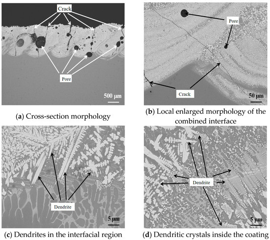 The cross-sectional morphology of the laser-clad (LC) coating is illustrated in Figure 7a,b. The LC coating exhibits a thickness greater than 1 mm, with a tightly bonded interface to the substrate that reflects a metallurgical bonding morphology. Generally, metallurgical bonding is more robust than mechanical bonding, indicating that the WC-10Co-4Cr coating produced by LC possesses a higher interface bonding strength with the substrate compared to the WC-10Co-4Cr coating fabricated by APS. Figure 7c,d show a significant presence of dendritic structures within the coating. Numerous large gas pores and cracks are observed, which arise from the rapid melting and cooling of powder particles under the influence of high laser energy. The retention of gas within the molten pool, which was not promptly expelled, results in the formation of gas pores, while the cracks are primarily due to excessive thermal stress leading to coating failure. As the distance from the laser head increases, the amount of heat received diminishes; thus, a temperature gradient exists perpendicular to the coating surface during its formation. Consequently, crystal growth preferentially occurs in this direction, while lateral growth is relatively slower, ultimately resulting in the formation of dendritic structures characterized by a larger central region and shorter tips at both ends [24].