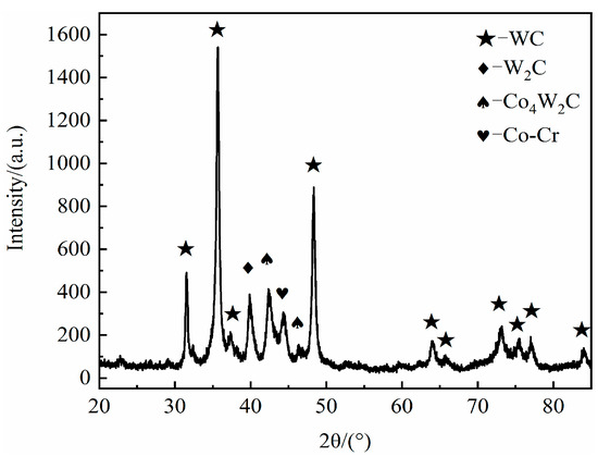 As shown in Figure 8, the XRD pattern of the LC coating primarily features diffraction peaks corresponding to the WC phase, with supplementary peaks from W2C, Co4W2C, and CoCr phases. Research by Shi [16] indicates that, during the laser cladding process, a small amount of WC undergoes decarburization and decomposition to form W2C. Additionally, the WC-10Co-4Cr powder decomposes into solid and liquid phases, where the liquid Co combines with solid W2C to form Co4W2C. Compared with Figure 6, it can be observed that the APS coating is mainly composed of the W2C phase, while the LC coating is mainly composed of the WC phase. This indicates that the temperature generated during the APS process is higher, which promotes the decomposition of WC. This observation suggests that the extent of WC phase decomposition in the LC coating is lower than that in the APS coating.
