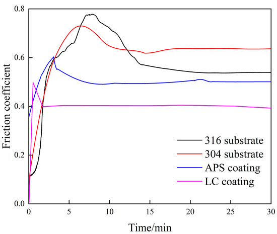 Figure 9 shows the variation of the friction coefficients of the substrate and the coatings with time. It can be observed that, in the initial stage of the friction test, both the substrate and the coatings exhibit a stage where the friction coefficient increases rapidly, and then it decreases to a stable state. Compared with the substrate, both the APS coating and the LC coating demonstrate excellent wear resistance. The friction coefficient of the APS coating gradually stabilized after approximately 8 min, while that of the LC coating stabilized after just 2.5 min. This initial period of run-in is primarily determined by the structural uniformity within the coatings; the more uniform the internal structure, the quicker and more stable the friction process becomes [28]. Therefore, it can be concluded that the structural uniformity of the LC coating is superior to that of the APS coating. After entering the stable friction state, the friction coefficient of the APS coating is approximately 0.45, while that of the LC coating stabilizes at around 0.4, indicating less wear of the LC coating. Further mass-loss tests show that the mass loss of the APS coating after wear is approximately 0.005 g, while that of the LC coating is approximately 0.002 g, confirming that the wear resistance of the LC coating is higher than that of the APS coating. Ceviz et al. [29] prepared WC-10Co-4Cr coatings on AA7075-T6 substrates by HVOF. The friction coefficient of the coatings at 200 °C was approximately 0.48. This further demonstrates that the WC-10Co-4Cr coatings prepared by LC in this paper possess excellent wear resistance.