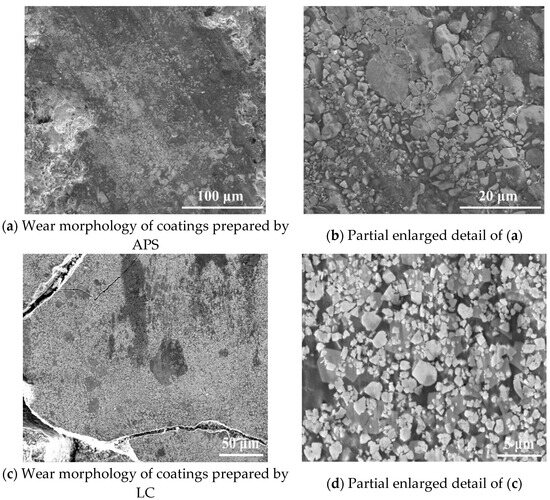 As shown in Figure 10a,b, the APS coating exhibited a significant amount of fragmented particles on the surface after wear, with extensive wear pits exposing the underlying coating. In contrast, Figure 10c,d demonstrate that the LC-produced WC-10Co-4Cr coating, after wear, exhibited only a few cracks (which were formed during the laser cladding process) along with a large number of fine particles; however, the overall structure remained relatively intact, showing a more uniform wear pattern. These observations indicate that the LC coating demonstrates greater resistance to fatigue failure during prolonged friction wear compared to the APS coating, thus reducing the likelihood of extensive layer spalling. Therefore, it can be concluded that the LC coating possesses superior wear resistance compared to the APS coating. This conclusion is consistent with the previous analyses of the friction coefficient curves and mass loss, further enhancing the accuracy of the findings presented in this study.