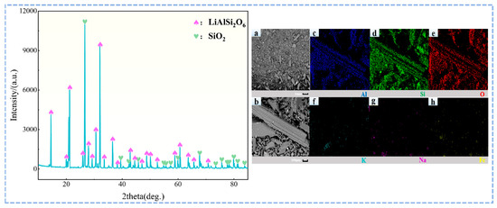 (left) XRD analysis. (right) SEM-EDS spectrum of the spodumene used in the experiment. (a) SEM images; (b) SEM images; (c) Al element distribution; (d) Si element distribution; (e) O element distribution; (f) K element distribution; (g) Na element distribution; (h) Fe element distribution.
