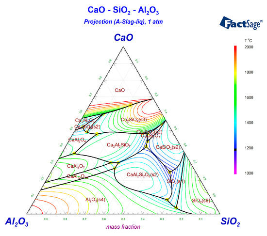 The CaO-Al2O3-SiO2 ternary phase diagram was simulated using FactSage7.2, as shown in Figure 2.
