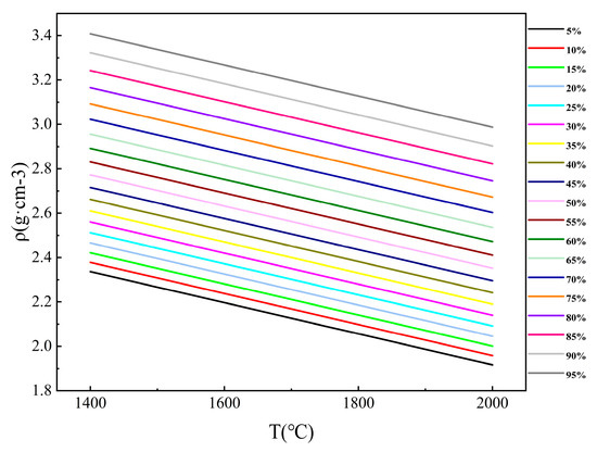 According to the FactSage7.2, the density under different CaO content was calculated, as shown in Figure 4. It can be seen intuitively from the figure that the density of slag decreases with the increase in temperature, but with the increase of CaO content in slag, the density of slag increases gradually. The density of the slag is about 2.1–3.3 g/cm3, and the density of the manganese-silicon alloy is generally 6.3 g/cm3, so all the calcium oxide content meets the requirements.