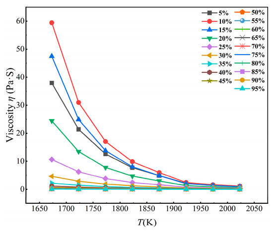 The viscosity of molten slag in industrial production is generally between 0.1 and 0.5 Pa·s, and the flowability is good. Between 1.5 and 2 Pa·s, it hardly meets the melting requirements; a viscosity greater than 3 Pa·s will hinder the melting process and make the slag difficult to discharge. When it is greater than 10 Pa·s, the melting process can hardly proceed normally, but the viscosity value can not be less than 0.1 Pa·s. A viscosity less than 0.1 Pa·s will cause splashing [34].