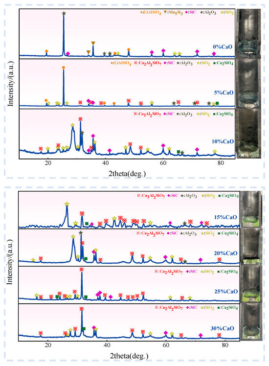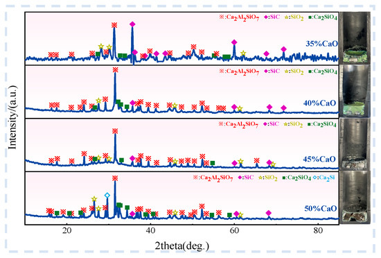 It can be seen from Figure 9 that when CaO was not added, the initial melting temperature of the slag was not measured, and the maximum test temperature of the equipment was 1600 °C. Therefore, the melting point of the slag phase should be higher than 1600 °C when CaO is not added. When the calcium oxide content was 5–50%, the initial melting temperature of the slag was 1448 °C, 1346 °C, 1254 °C, 1317 °C, 1239 °C, 1266 °C, 1240 °C, 1324 °C, 1269 °C, 1305 °C, respectively. The melting point decreases, increases, and then decreases with the increase in the amount of calcium oxide, which is consistent with the theoretical analysis results. There was a small amount of SiC in the slag, which led to a small difference between the melting point and the theory. The melting point of slag with 5–25% CaO content shows a downward trend. When the CaO content is 25–35%, the melting point is low. When the CaO content is 25%, the melting point of the slag is the lowest at 1239 °C. When the CaO content is 35–40%, the melting point of the slag generally increases. When the CaO content is 35%, the melting point of the slag is lower at 1240 °C.
