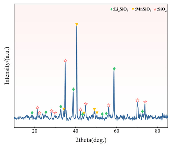 Because of the small amount of feed and low lithium content in the raw material, it was difficult to collect the lithium-rich ash effectively, so we collected the lithium-rich ash after many experiments. The collected lithium-rich ash was subjected to XRD detection, as shown in Figure 7. From the figure, we can see that Li mainly existed in the form of Li2SiO3, which was due to the formation of eutectic compounds between Li2O and SiO2 at 1301 K–1474 K [35]. Li in the raw material was removed in the form of Li vapor, and Li2O was formed in the presence of air, which reacted with SiO2 to form Li2SiO3. The content of Li2O in the condensate detected by an atomic absorption spectrophotometer was 4.31%, which was 10.81 times higher than that of the raw material spodumene.