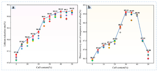 The lithium reduction rate at different CaO contents is shown in Figure 8a. Five groups of experiments were carried out for each CaO content; the highest lithium reduction rate was drawn into a line chart, and the rest was drawn in a scatter diagram. It can be seen from the diagram that the reduction rate of lithium increases with the increase in CaO content, indicating that the addition of CaO can promote the reduction of lithium.