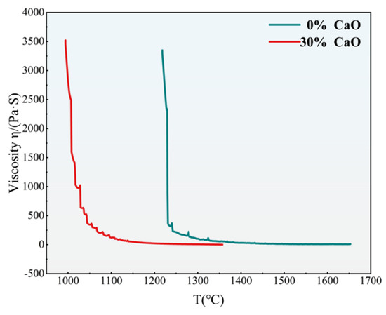 Based on the XRD, lithium reduction rate, alloy direct yield, and melting point detection, the optimum CaO addition amount was analyzed when the CaO content was 30%. Therefore, we chose the optimum CaO content, that is, when the CaO content is 30%, to analyze the viscosity of the slag without calcium oxide.