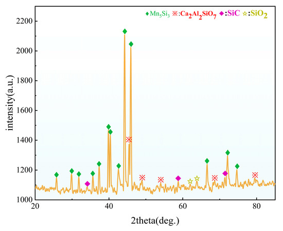 According to the XRD, physical map, lithium reduction rate, and direct recovery rate of manganese-silicon alloy, when the content of CaO is 30%, the melting point of slag is 1266 °C, and the melting point of Mn5Si3 is 1320 °C [36]. The slag can be melted first to surround the alloy, which plays a role in heat preservation and air insulation for the metal melt, reducing the oxidation of metal; the lithium reduction rate is 99.02%. The highest direct yield of manganese-silicon alloy is 89.12%, the alloy aggregation effect is the best, and the slag–metal separation is obvious. Therefore, it is considered that the CaO content of 30% is the best CaO addition.