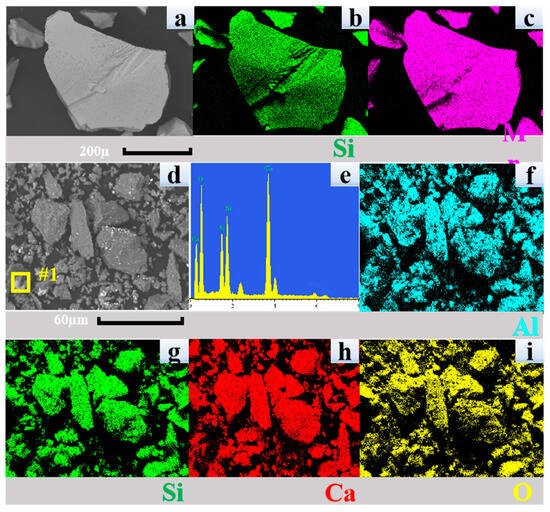 SEM-EDS images of the alloy and slag: (a) SEM images; (b) Si element distribution; (c) Mn element distribution; (d) SEM images; (e) one-point sweep spectrogram; (f) Al element distribution; (g) Si element distribution; (h) Ca element distribution; (i) O element distribution.
