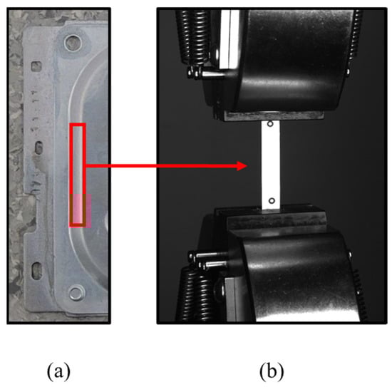 (a) Schematic diagram of the cutting position of the specimen in the stamping area; (b) schematic of the tensile testing process with the DIC system.