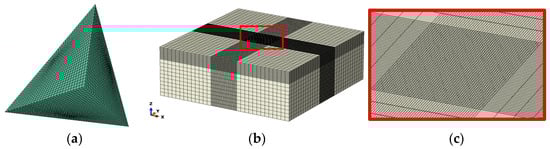 The nanoindentation process was simulated using ABAQUS/Standard with a three-dimensional model, as shown in Figure 4. The model comprises a deformable single-crystal matrix and a rigid indenter. The single-crystal matrix model has dimensions of 50 μm × 50 μm × 20 μm, containing 96,000 elements. The type of element is C3D8R, with reduced integration and applied enhanced hourglass control to improve the accuracy of the simulation and mitigate potential convergence issues. In order to enhance simulation accuracy, a refined mesh is applied to the region near the contact between the single-crystal matrix and the indenter. The maximum element size of the single-crystal matrix finite element model is 2 μm, and the minimum element size is 0.167 μm. The mesh has been thoroughly tested for convergence to ensure reliable results. The indenter model was simplified as a rigid body, with an element size of 0.005 mm and element type C3D8R. The simulation is controlled through displacement. A displacement along the negative z-axis is applied to the indenter, with a value of 500 nm. These settings are consistent with the actual experimental conditions. The depth of indentation is less than one-tenth of the model thickness, which can avoid the impact of fixed constraints on the bottom []. Fixed constraints are applied to the bottom and side surfaces of the single-crystal model. For contact interaction, a surface-to-surface contact mode with hard contact conditions is used to prevent penetration between the contact surfaces, allowing infinitely large normal forces. Additionally, [] indicates that the effect of friction on the load–displacement curve is negligible. Therefore, tangential contact is set to a finite sliding mode, with no friction between the contact surfaces.