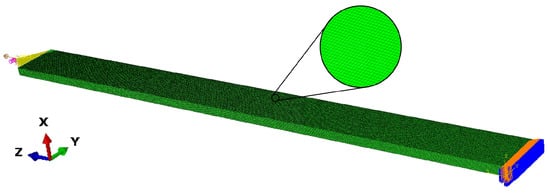 A geometric model is established based on the actual dimensions of the tensile specimen, and a discretized mesh is generated using the C3D8R element type. To balance computational accuracy and speed, the element size was set to 0.1 mm × 0.1 mm × 0.1 mm, resulting in 256,000 elements. As shown in Figure 5 one end of the specimen is completely fixed, with all degrees of freedom restricted. The other end is coupled to a reference point, where a loading rate along the positive z-axis is applied. The coupled nodes move with the reference point. The time period was set to 150 s, and the time increment was set to 0.3 s, which reduces the amount of data while ensuring data accuracy.