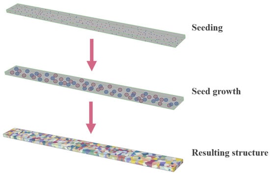 Polycrystalline models were generated using the SSP method []. The main idea of this method is to progressively pack a pre-meshed model into multiple sets based on a specific growth formula. First, some elements are randomly selected from the meshed model, and the coordinates of their center points are used as seed points. Each selected element is assigned a non-zero digital index (DI), while the DI of other elements remains zero. After the random seeding, a specific growth equation is applied to grow the seeds. The growth rate of the seeds in different directions can be specified according to the growth equation. Ellipsoid, sphere, and cylinder equations are fundamental analytical functions that allow us to construct typical microstructures of various materials. As per this function, the volume around the seeds increases at each step of the SSP process. During the growth process, the growth step length is set to one-third of the grid length. Figure 6 illustrates the process of generating a tensile polycrystal model using the spherical growth equation based on the SSP method. As the volume of all crystals increases, for every element that does not belong to any crystal, the coordinates of its center point are checked to see if they fall within the volume of any crystal. If this is the case, the zero DI of the element is replaced by the corresponding seed’s DI, and the element is assigned to the corresponding crystal. The SSP process is repeated until all elements have a non-zero DI.