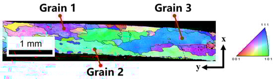 Based on EBSD testing, three grains with different orientations in Figure 8 were selected to obtain their orientation information. These orientations were then applied to nanoindentation simulations. Table 3 shows the orientation information of the three grains. The orientation of Grain 2 shown in Table 3 is similar but not identical to the main orientation shown in Table 2. The main orientation shown in Table 2 is obtained from the grain orientation distribution of the material’s overall region. Therefore, in subsequent simulations, the two similar grain orientations will be used independently based on the simulation requirements.
