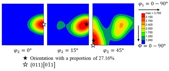 The Inverse Pole Figure (IPF) [001] obtained from the EBSD test for the stamping area is shown in Figure 7. According to the test results, the grain size in this area is uneven, with an average size of approximately 1.32 mm for large grains. The size ratio along the x-direction to the y-direction is 0.2. The measurement of another surface shows that the ratio of the x-direction to the z-direction is also close to 0.2. Based on the EBSD results, the Orientation Distribution Function (ODF) was analyzed and is shown in Figure 8, and the overall texture strength is relatively low, at only 3.755. Orientation distribution analysis shows that the orientation in Table 2 accounts for approximately 27.16%, which is referred to as the “main orientation”. This main orientation is close to the {011} [0–11] orientation. The proportions of other orientations are relatively small.