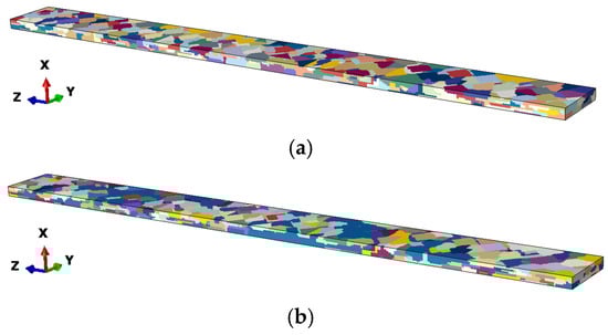 Based on the known microstructure, a polycrystalline model as shown in Figure 9a was generated using SSP method. According to the average grain size, there should be 800 grains in the specimen model. Therefore, 800 seeds were randomly selected from all elements and the grown ratio was set as 5:5:1 along the x-, y-, and z-axes. The EBSD results indicate that the grains with orientations similar to that shown in Table 2 are mostly large grains. Therefore, among the 800 grains in the polycrystalline model, grains with larger sizes were assigned this orientation, and the cumulative volume proportion was 27.16%. The remaining grains were assigned random orientations. After redistributing the orientation, the polycrystalline model is shown in Figure 9b. It can be seen that the generated polycrystalline model also has an uneven microstructure, which is similar to the real one.