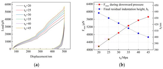 To determine the plastic parameters, a series of simulations were performed with a rough mesh, and the resulting numerical load–displacement curves were compared. It was found that and have a significant impact on the simulated load–displacement curve, while other parameters have very little effect on the curve. According to Figure 10a,b, as increases, the peak load rises, while the final residual indentation height decreases. In the hardening model proposed by Peirce D, is defined as the minimum shear stress required for slip systems to initiate sliding. Therefore, is directly related to the yield strength of the material. The smaller the value of , the more likely the material is to undergo plastic deformation. As shown in Figure 10c,d, the increase in leads to an increase in peak load and final residual indentation height. represents the saturated flow stress and determines the ultimate value of stress during plastic deformation. Therefore, a larger may bring higher strength limits to the material.