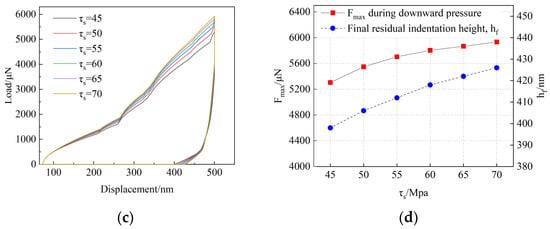 The influence of parameters on the nanoindentation simulation results of single crystal with orientation of Grain 2 shown in Figure 8: (a) the simulated displacement–load curves with different ; (b) the influence of on the maximum load and final residual height; (c) the simulated displacement–load curves with different ; (d) the influence of on the maximum load and final residual height.