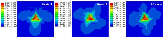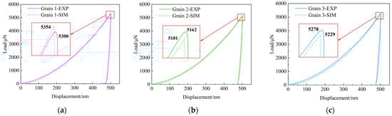 Additionally, the Young’s modulus was determined from the unloading segment of the displacement–load curve obtained from the nanoindentation experiments []. For each grain, the Young’s modulus was calculated by averaging the values obtained from nine test points. The Young’s moduli for the three grains are presented in Table 5. The average Young’s modulus of the material was then computed to be 80.13 GPa. The relative error between the simulation and experimental results for the Young’s modulus is only 0.16%. Therefore, the elastic constants listed in Table 4 are deemed valid and will be utilized in the subsequent simulations.