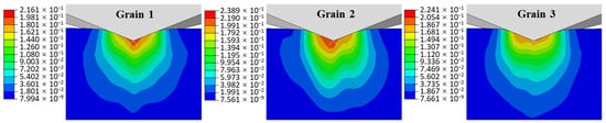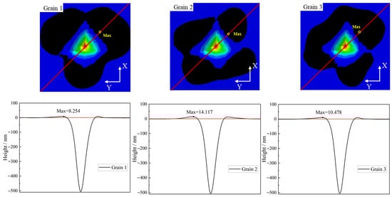 During the nanoindentation experiment, when the indenter slowly presses into the surface of the material, plastic deformation occurs, and complex stress states are generated in the indentation area. These stresses cause the material to flow and deform. Figure 13 and Figure 14 depicts the Mises stress and true strain of three different orientations of grains during nanoindentation simulation. Due to the anisotropy of crystal materials and the activation of different slip systems, there are variations and asymmetry in the distribution of stress and strain under different crystal orientations. Among the three grains, Grain 1 experiences the highest Mises stress during indentation, while its true strain is the lowest. Figure 15 shows the indentation pile-up morphology and height of grains with different orientations during the indentation process. Due to the fact that the maximum pile-up height in the simulation occurs on the indentation diagonal, the coordinates of the nodes on the indentation diagonal shown in Figure 15 were extracted to observe the sinking and pile-up height. It is evident that the pile-up height of Grain 2 is the highest. The above phenomenon indicates that Grain 1 may have the higher structural stability and strength, while Grain 2, which exhibits softer material properties, undergoes more significant plastic strain. This indicates that grain orientation significantly affects the local deformation of the indentation area.