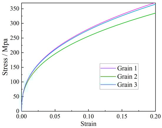The stress–strain curve obtained from the tensile simulation of the above polycrystalline model is shown in Figure 17. Figure 17 presents the results from two different simulation models. In one model, grains accounting for 27.16% of the total volume were assigned a main orientation (shown in Table 2), while the remaining grains were given random orientations. In the other model, all grains were assigned random orientations. It can be observed that the stress–strain curve obtained from the model with 27.16% main orientation shifts downward relative to the latter model and aligns better with the experimental results. This indicates that the calibrated crystal plasticity constitutive parameters and the polycrystalline model with reassigned orientations can effectively describe the mechanical behavior of the material. The difference between the simulation results of the two models is mainly attributed to the main orientation in the former model, which is similar to the orientation of Grain 2 shown in Table 3 and exhibits a lower yield strength and strain hardening exponent. The yield strength and strain hardening exponent of the grain with main orientation were determined to be 29.02 MPa and 0.3904, respectively, through nanoindentation simulations and the method [] described earlier. These grains with the main orientation made a significant contribution to the plastic deformation of the specimen during the tensile process.