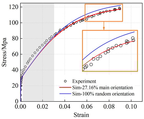 Stress–strain curves obtained from two simulation models and tensile test. The red curve corresponds to the model with 27.16% main orientation. The blue curve represents the model with 100% random orientations.