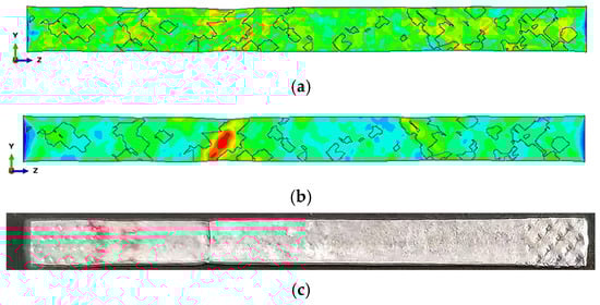 The stress and strain distributions during the tensile simulation are shown in Figure 18a,b. It can be observed that, when using the crystal plasticity constitutive model for tensile simulation, the stress and strain distributions are uneven. The black lines in Figure 18 outline the boundaries of the grains with the main orientation mentioned in Table 2. It can be observed that the areas with high strain are primarily concentrated in these grains. Figure 18c shows the specimen in the tensile test, and it can be observed that the stress concentration positions in the experiment and simulation are quite similar. Meanwhile, the stress concentration areas are not located at the center of the specimen, which is attributed to the inhomogeneous microstructure.