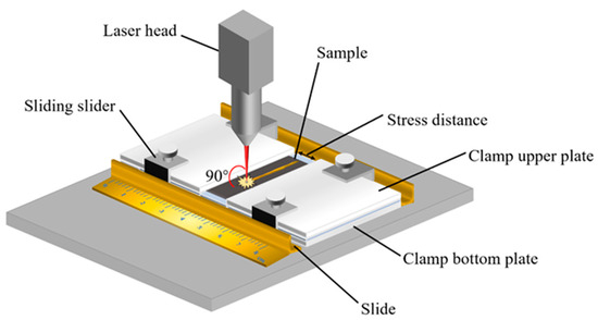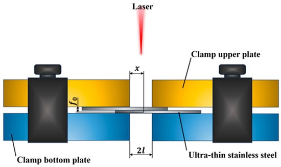 Figure 1 presents a schematic diagram of the custom-made welding clamp. The lower plate is fixed, while the upper plate is connected to a movable slider via bolts. This design enables precise adjustment of the fixed stress span, ensuring accurate positioning and stability during the welding process. The slider is designed to move freely along the slide, enabling the fixed stress span of the clamp to be precisely adjusted. Once adjusted, the slider is locked at the designated test position, as indicated in Table 1, to maintain dimensional stability throughout the welding process. The welding configuration is a lap joint, with the ultra-thin stainless-steel plates overlapping by 50% of their width. The welding path is positioned centrally within the overlap area. Before welding, the base material was ultrasonically cleaned with anhydrous ethanol to remove surface oil and contaminants, ensuring a clean surface for optimal weld quality. During welding, the laser focus was precisely positioned at the center of the lap area of the base material to ensure uniform energy distribution. Additionally, 99.99% pure argon gas was used as a shielding medium to prevent oxidation and contamination of the weld.