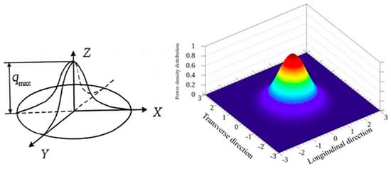 Figure 2. Gaussian heat-source energy distribution. The left diagram illustrates the theoretical model of the heat source, while the right 3D plot represents the power density distribution, with colors indicating intensity (blue: low, red: high).