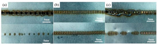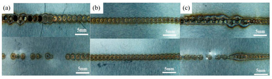 Figure 8. Effect of pulse frequency on weld surface morphology at a laser power of 600 W and a welding speed of 10 mm/s (a) 6 mm; (b) 10 mm/s; (c) 14 mm/s.