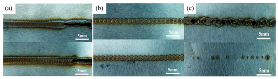 Figure 5. Effect of laser power on weld surface morphology at a welding speed of 10 mm/s and a pulse frequency of 10 Hz: (a) 500 W; (b) 600 W; (c) 700 W.