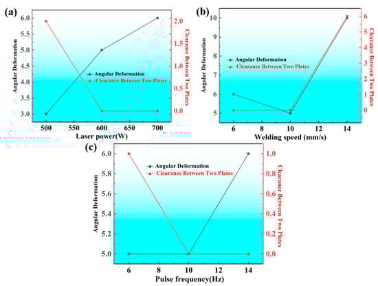 Figure 9. Effect of welding parameters on angular deformation and two-plate gap of welded joints: (a) laser power; (b) welding speed; (c) pulse frequency.