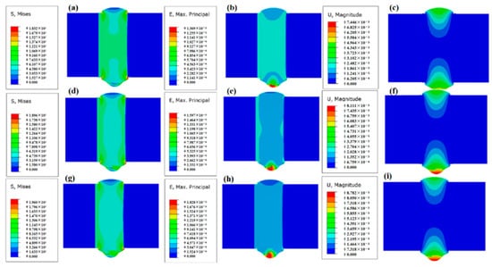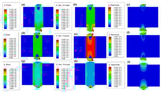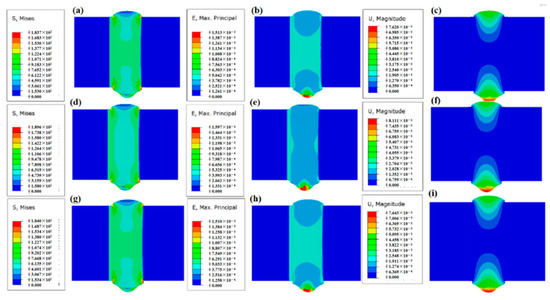Figure 11. Effect of welding speed on residual stress–strain and displacement distributions: 6 mm/s (a) stress field, (b) strain field, (c) displacement field; 10 mm/s (d) stress field, (e) strain field, (f) displacement field; 14 mm/s (g) stress field, (h) strain field, (i) displacement field.