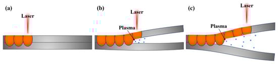 A high-speed camera was employed to investigate the deformation of 430 ultra-thin ferritic stainless steel in greater detail during the welding process. The results, presented in Figure 13, provide real-time visualization of dynamic deformation behavior, capturing critical phenomena such as warping, plasma generation, and cavity formation. Figure 14 presents a schematic diagram illustrating the deformation mechanisms of the ultra-thin stainless-steel plate during welding, offering a conceptual understanding of the dynamic interactions observed in the high-speed camera footage.