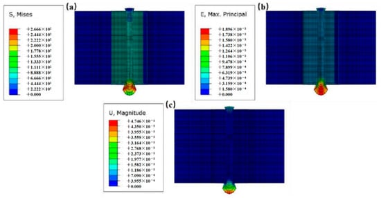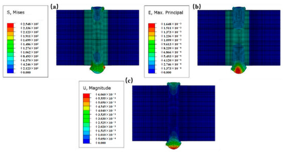 Figure 17. Stress, strain, and displacement fields in Case 9 for ultra-thin stainless steel welding: (a) stress field; (b) strain field; (c) displacement field.