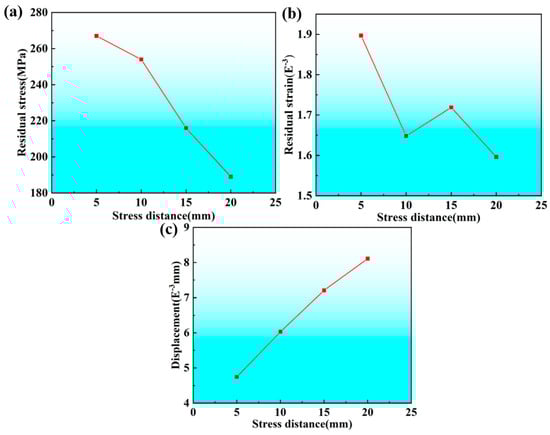 The effect of the fixed stress span applied by the clamp on the stress–strain and displacement fields is shown in Figure 19. The residual stress decreases as the fixed stress span applied by the clamp increases, from 267 MPa at 5 mm to 189 MPa at 20 mm. The strain value generally decreases with an increase in the fixed stress span; however, when the span is increased from 10 mm to 15 mm, the strain value rises slightly, from 1.648 × 10−3 at 10 mm to 1.719 × 10−3 at 15 mm. This is because increasing the span to 15 mm reduces the constraints applied by the tooling clamp on the two ultra-thin stainless-steel plates, thereby decreasing deformation restriction and increasing strain. The displacement value increases with the fixed stress span, from 4.746 × 10−3 mm at 5 mm to 8.111 × 10−3 mm at 20 mm, which occurs because increasing the fixed stress span reduces the area of the plates held by the tooling clamps, thereby reducing constraints and increasing deformation. The simulation analysis predicts that when the stress span applied by the clamp is 5 mm, the surface morphology of the weld is optimal.