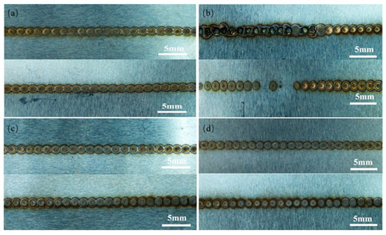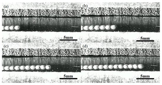 To validate the influence of the fixed stress span applied by the clamp, as determined by finite element analysis, on weld seam formation, actual tests were conducted to simulate the process. The welds obtained from these tests are shown in Figure 20 and Figure 21. When the fixed stress span applied by the clamp is 20 mm, the plates are well-formed, with continuous weld joints and no weld penetration; however, significant angular deformation is observed. At a 15 mm span, the upper plate exhibits severe weld penetration, while the lower plate shows discontinuous weld joints. For a 10 mm span, the plates are well-formed, featuring clear weld joints and no gap between them; however, the overlap rate of weld spots is lower compared to the 20 mm span. Finally, when the fixed stress span is reduced to 5 mm, the weld seam is well-formed with no significant welding deformation.